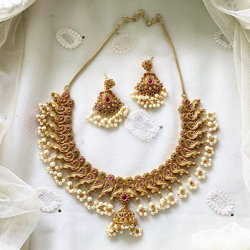 Gold-Plated Peacock Motif Kemp & Zirconia Crystal Studded Handcrafted Necklace Set